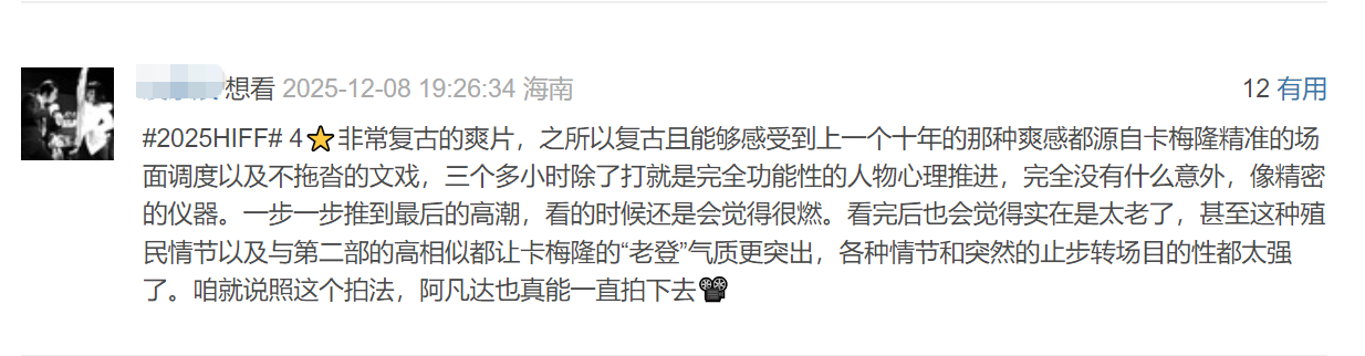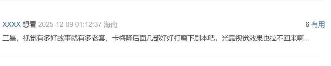 还有更加毒舌的评价,这位观众先是肯定卡梅隆“精准的场面调度以及不拖沓的文戏”对作品节奏和拍摄技术的掌控非常到位,但“卡梅隆的‘老登’气质更突出,各种情节和突然的止步转场目的性都太强了。”