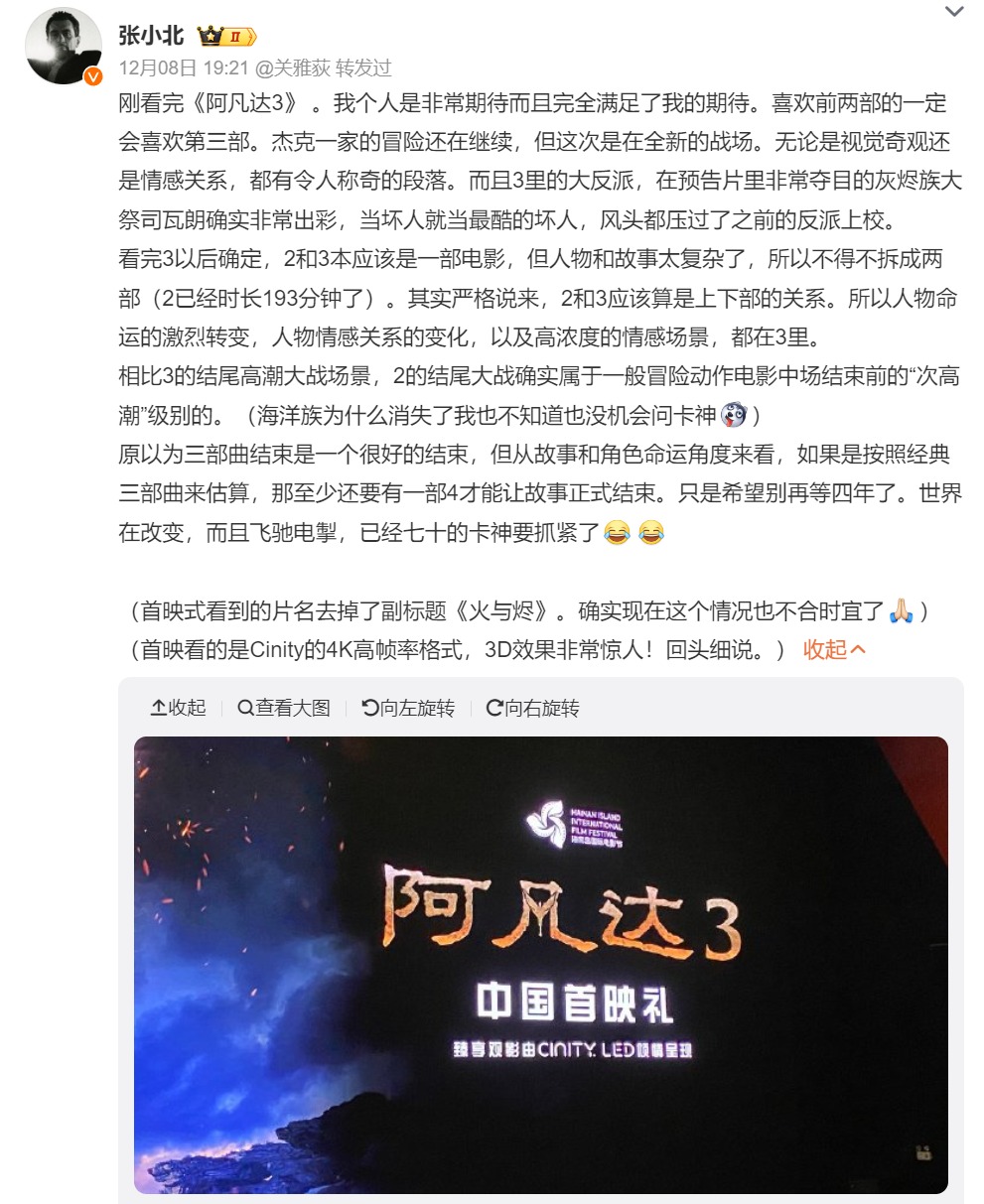 海南岛国际电影节上深圳股票配资论坛,《阿凡达3》(首映现场去掉了“火与烬”,应该后面就不会有这三个字,就叫《阿凡达3》了)举办了原本计划取消的中国首映礼,卡梅隆带着女主角佐伊·索尔达到海南宣传,为电影配音的章子怡、孙俪、邓超、黄轩也到场助阵。同时,电影在首映礼上完成了国内的首场完整影片放映。我们先总结一下口碑,再说结论。