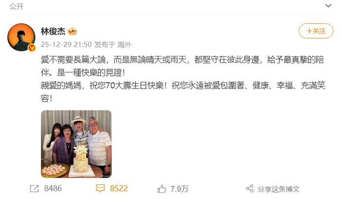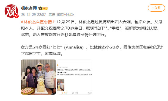 林俊杰官宣恋情。12月29日,林俊杰通过微博晒出四人合照,包括女友、父母和本人,并配文祝福母亲70岁生日深圳股票配资论坛,强调“陪伴”与“幸福”,被解读为间接认爱。此前,两人曾被网友在洛杉矶偶遇穿情侣装同行。女方是24岁网红“七七”(Annalisa),比林俊杰小20岁,网传为美国帕森斯设计学院留学生,家境优渥。
